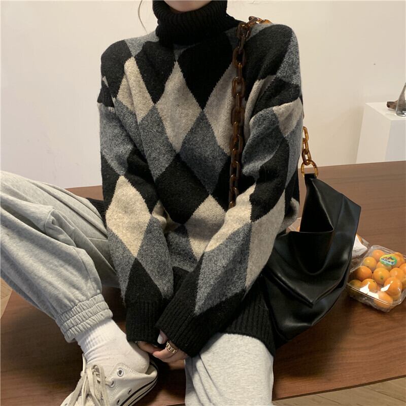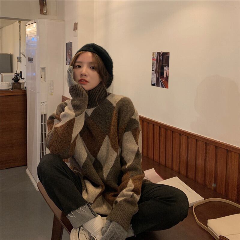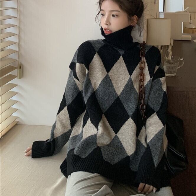 トップス ニットソー セーター ロング ロング丈 袖あり 長袖 ボリューム袖 ドロップショルダー 萌袖 襟付き ハイネック ワイド ニット かわいい 大人可愛い カジュアル 大人 おしゃれ お洒落 大人女子 ラフ キュート ガーリー ルーズ 格子柄 秋 冬 10代 20代 30代 40代 レディース 女性用 ママ マタニティ 女の子 学生 通学 デート お出かけ 女子会 休日 旅行 普段使い 楽ちん 暖かい モテ 体系カバー M L XL ゆったり ゆる 黒 ブラック 茶色 | Ritta