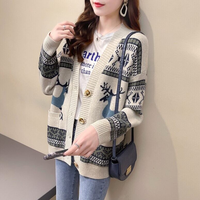 カウチン風の柄が秋冬にピッタリのニットカーディガン。