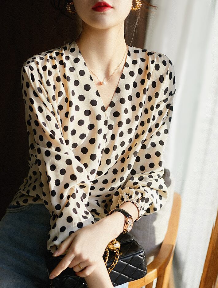トップス ブラウス カットソー 7分袖 七分袖 ボリューム袖 パフスリーブ Vネック カシュクール 襟なし シフォン 透け感 薄手 かわいい 大人可愛い きれいめ 大人 上品 おしゃれ お洒落 レトロ 大人女子 こなれ感 ラブリー キュート ガーリー とろみ感 抜け感 ドット柄 水玉 春 秋 10代 20代 30代 レディース 女性用 オフィス ビジネス OL 通勤 学生 通学 デート お出かけ 女子会 旅行 ホテル レストラン 普段使い モテ S M L XL 2XL アプリコット | Ritta