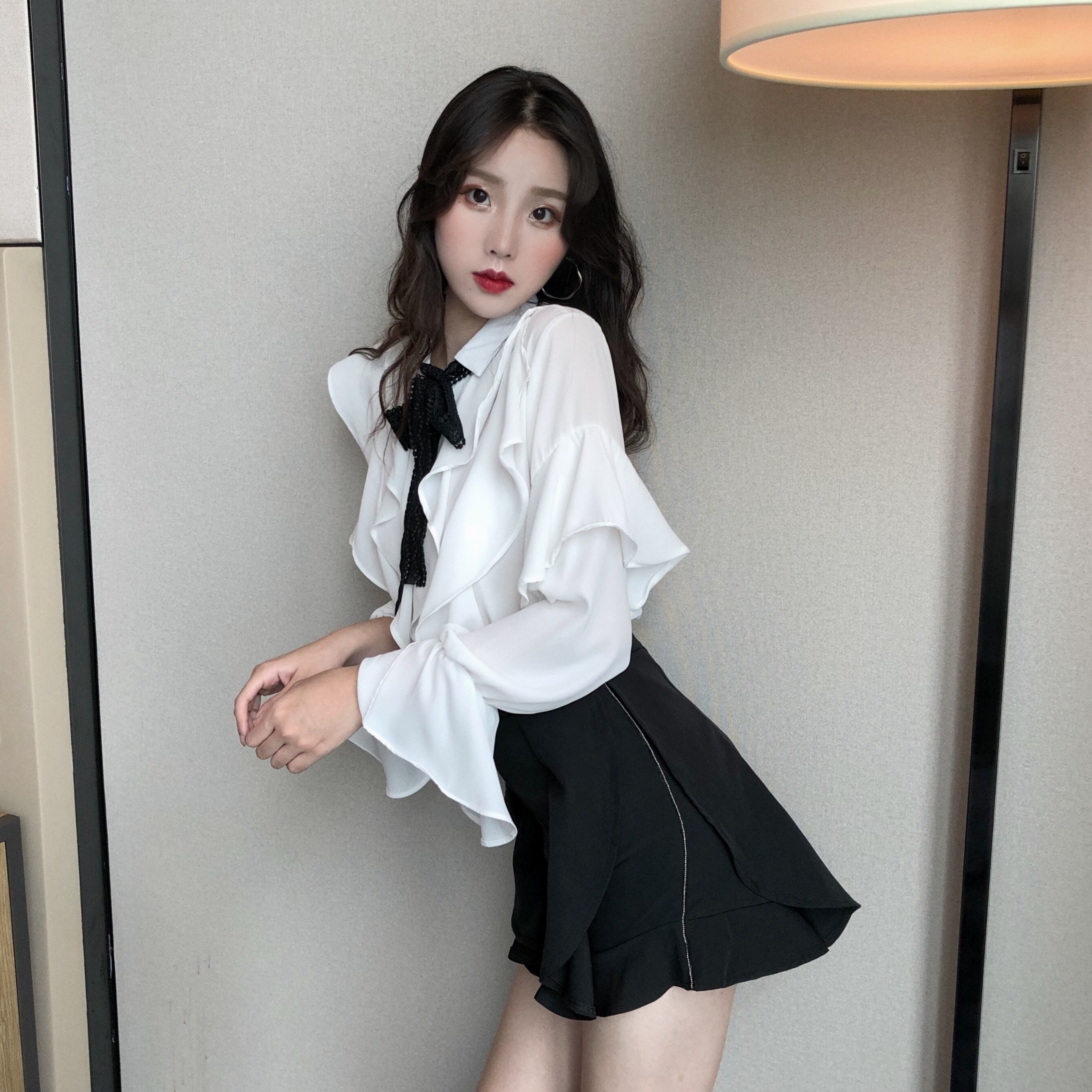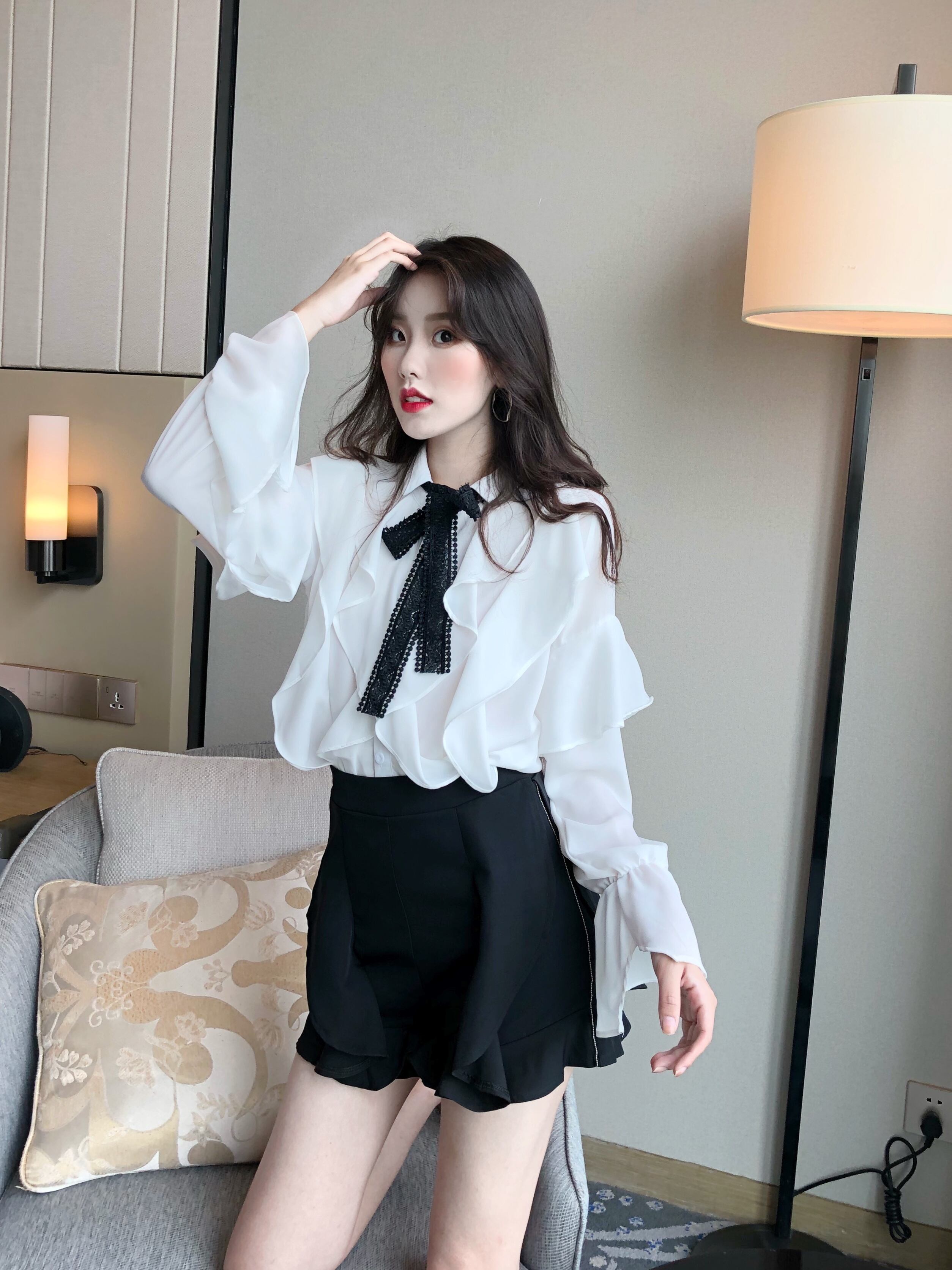 大胆なフリルとレースのリボンがアクセントのシャツ。