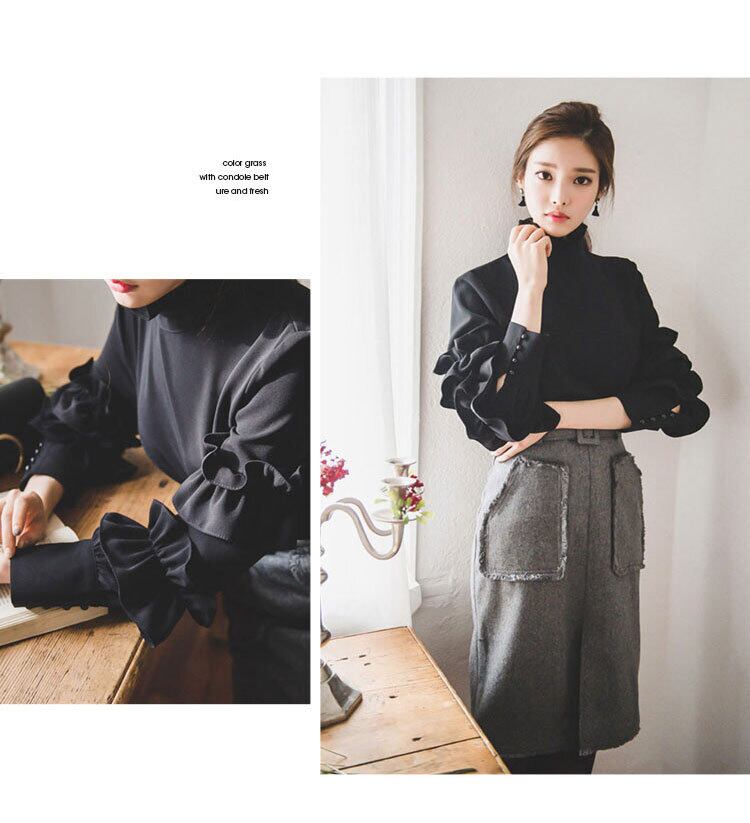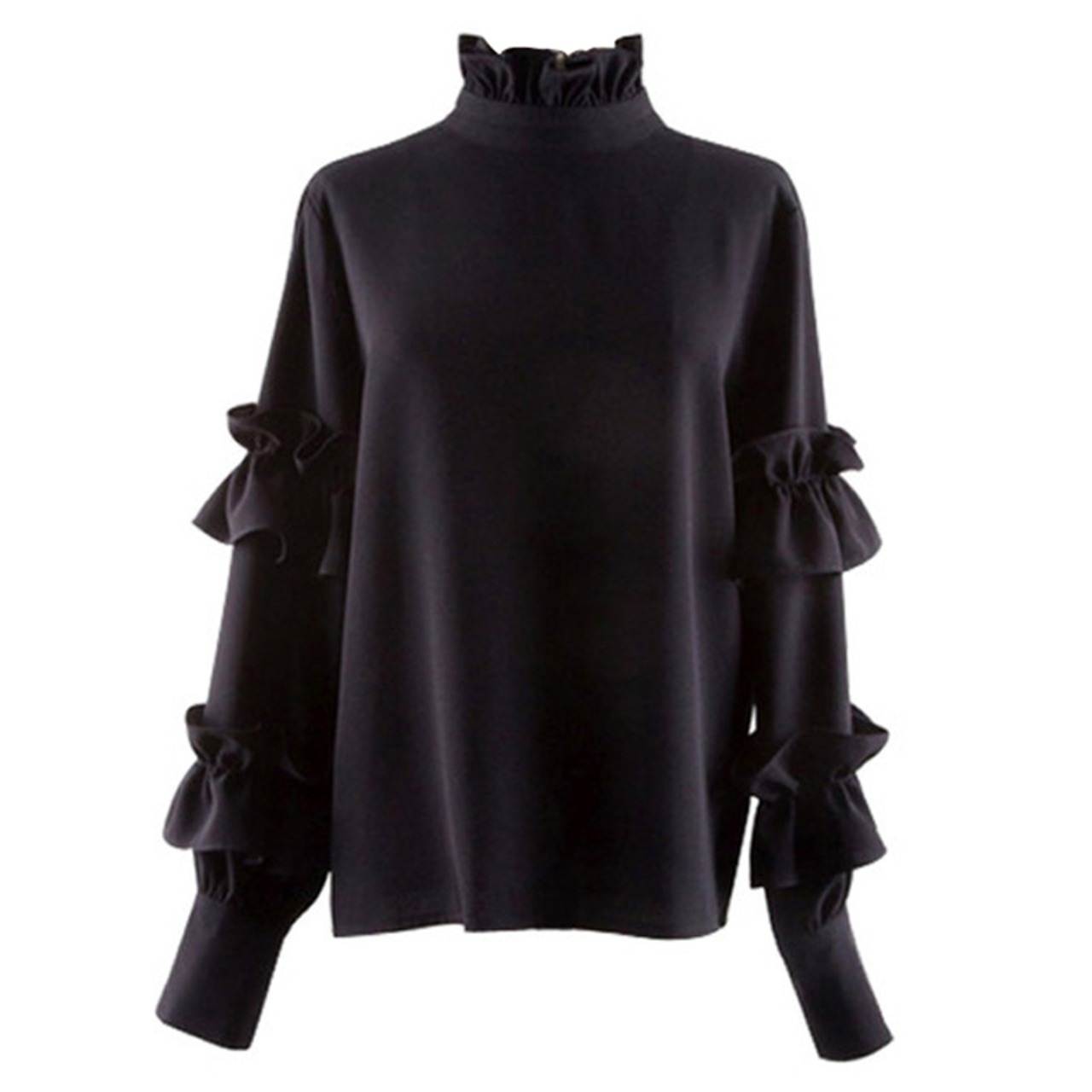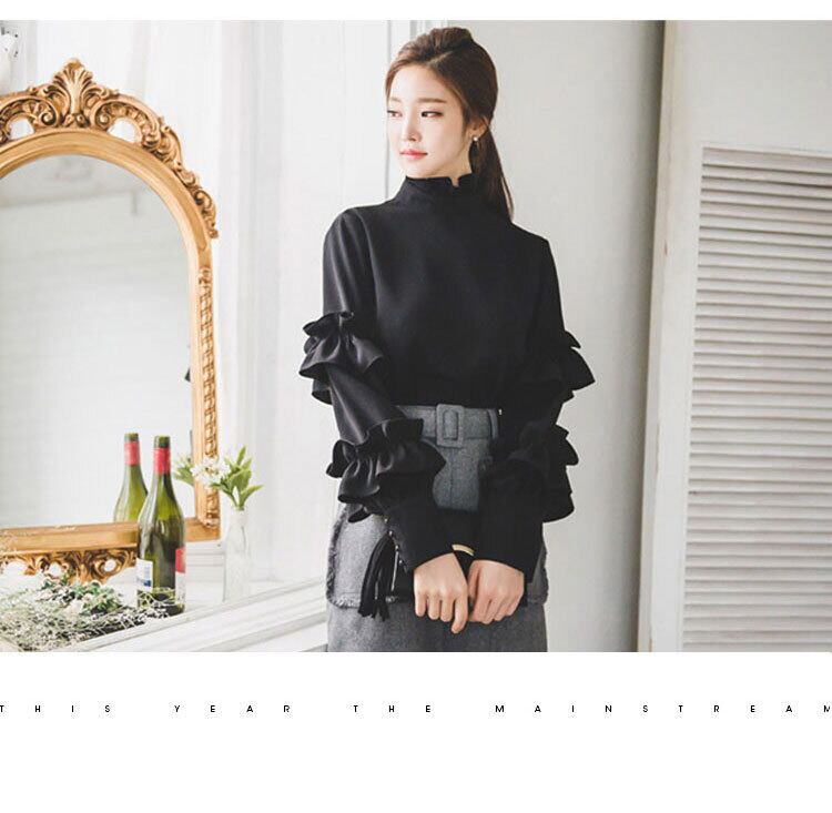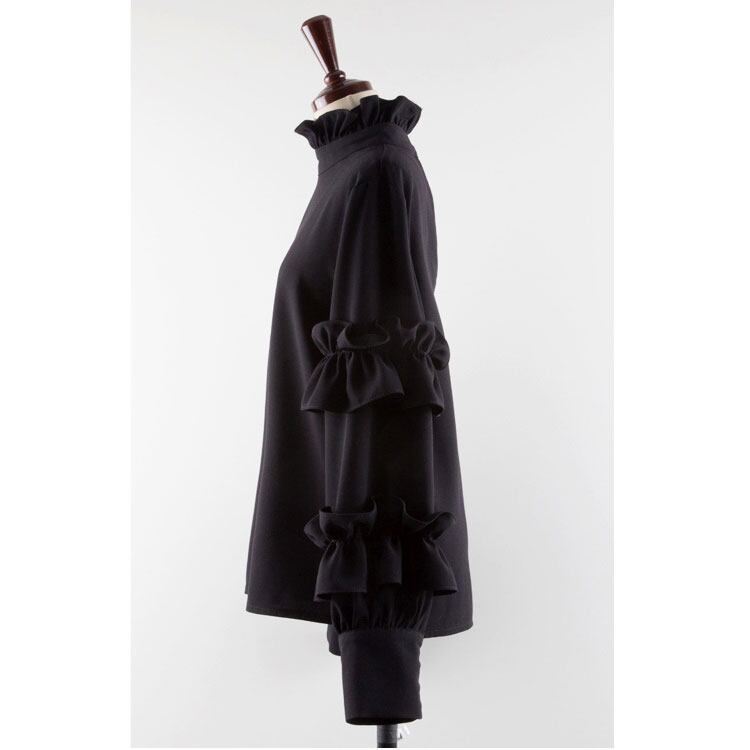 エレガントな袖とハイネックのフリルが素敵な女性らしいブラウス。