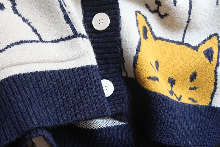 前面にデザインされた猫のキャラクターが特徴のニットカーディガンです。