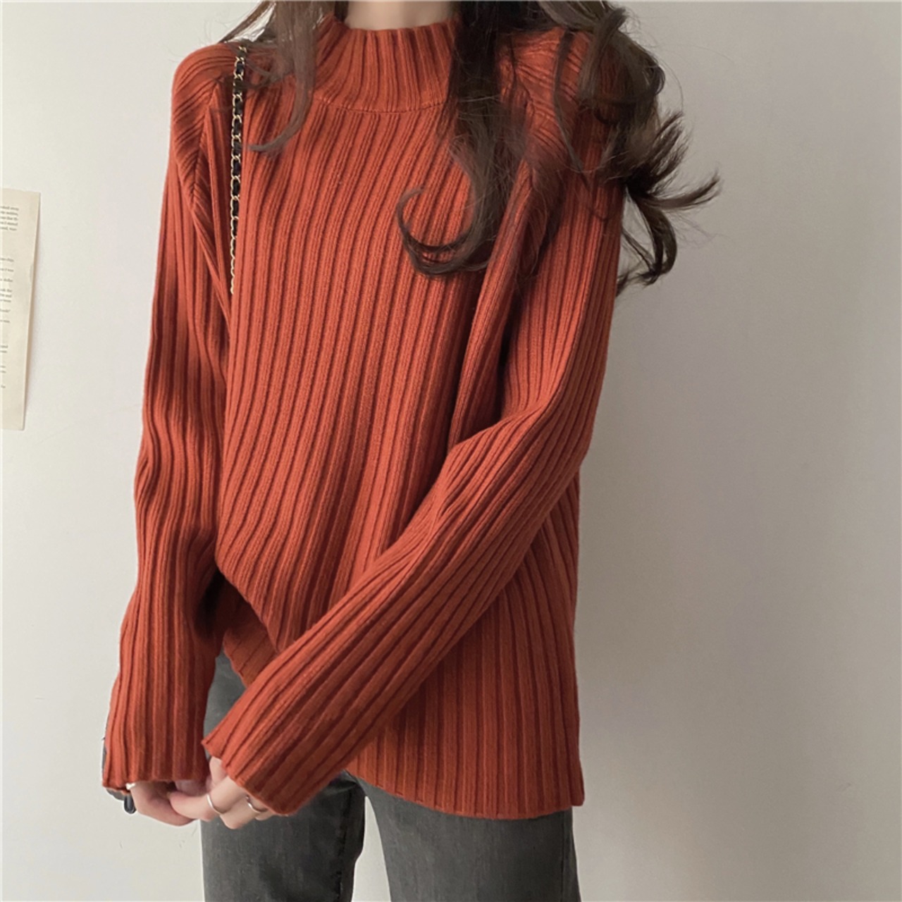 オーバーサイズのハイネックセーターは、冬の定番アイテム。