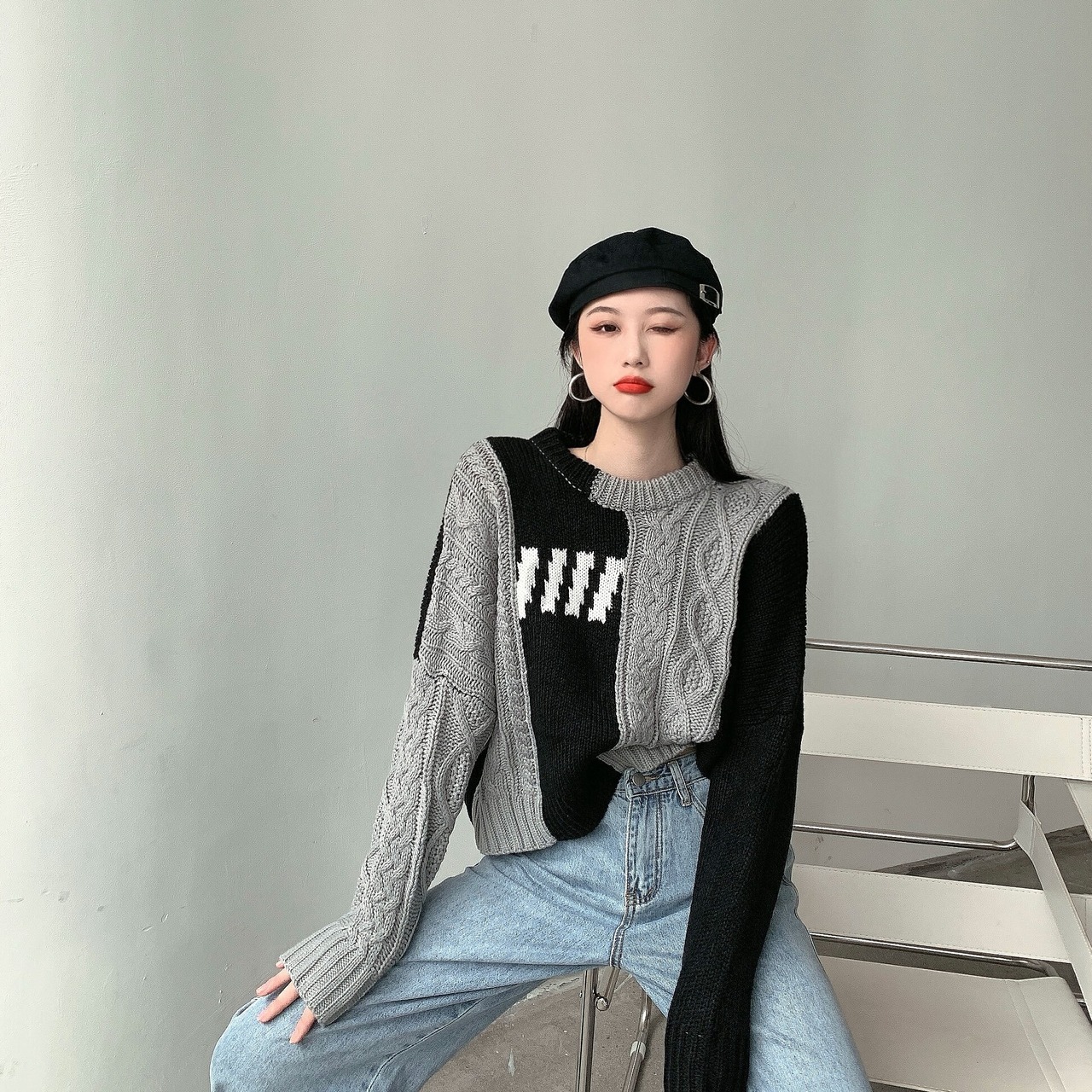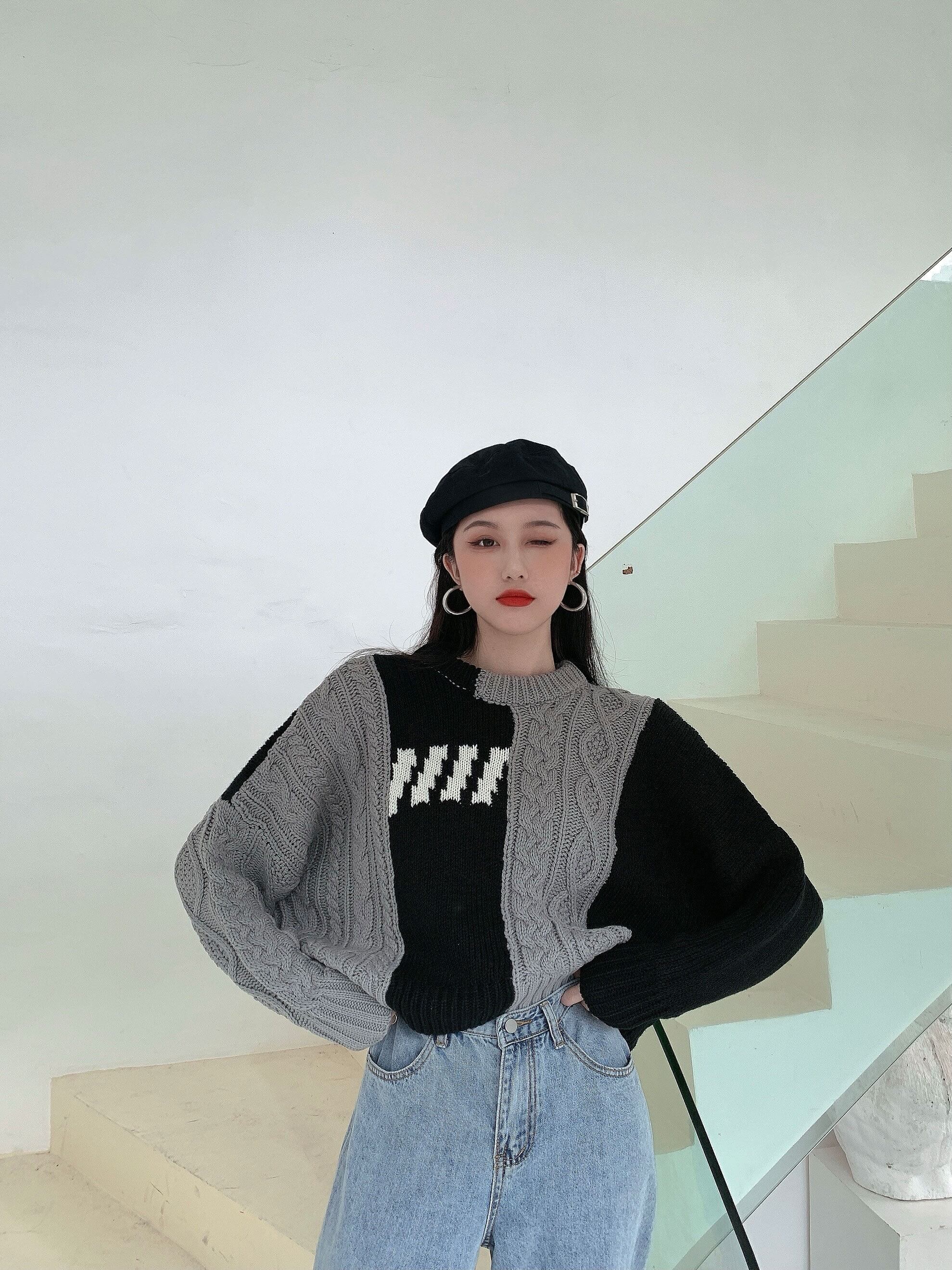 半分ずつデザインが違う、ルーズなシルエットのニット。