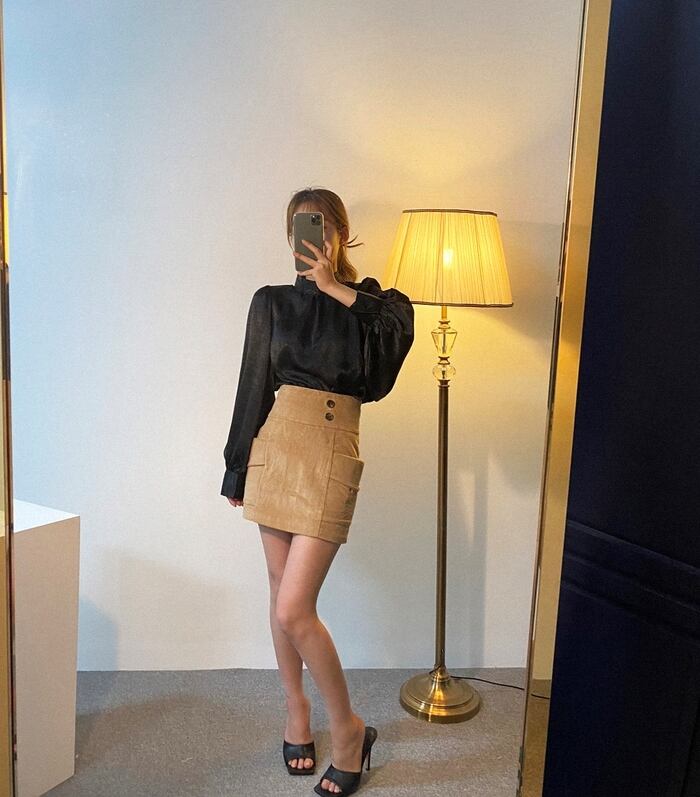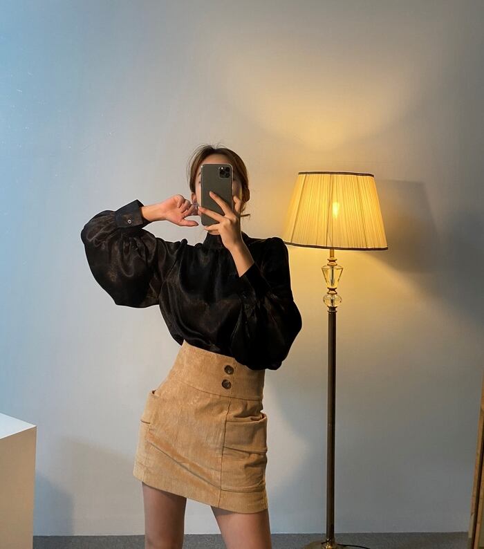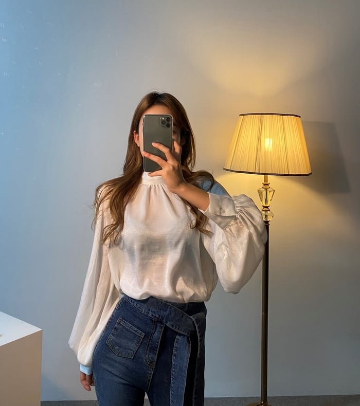 スカートでもパンツでも、このシャツ1枚でフェミニンな着こなしに。