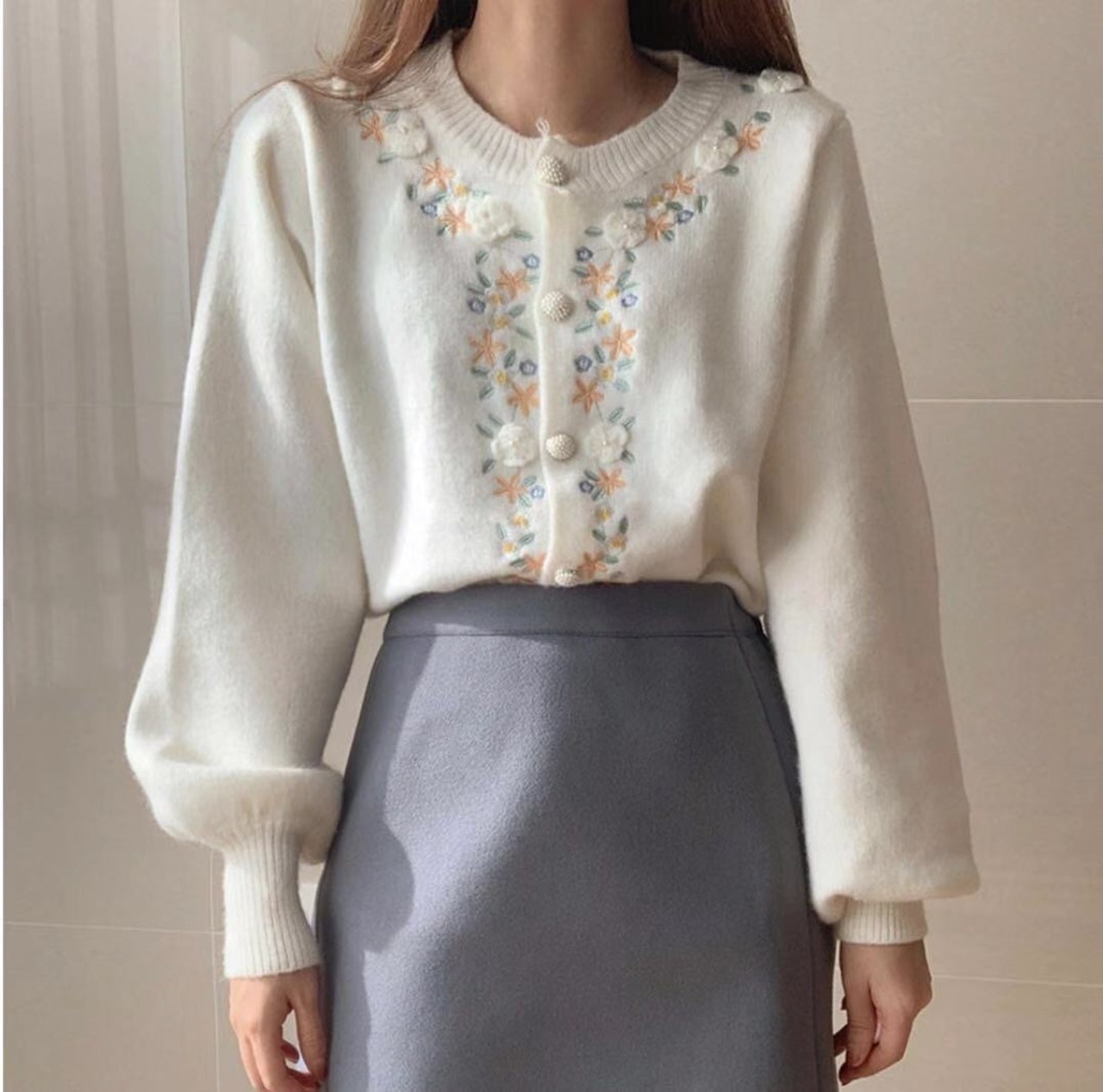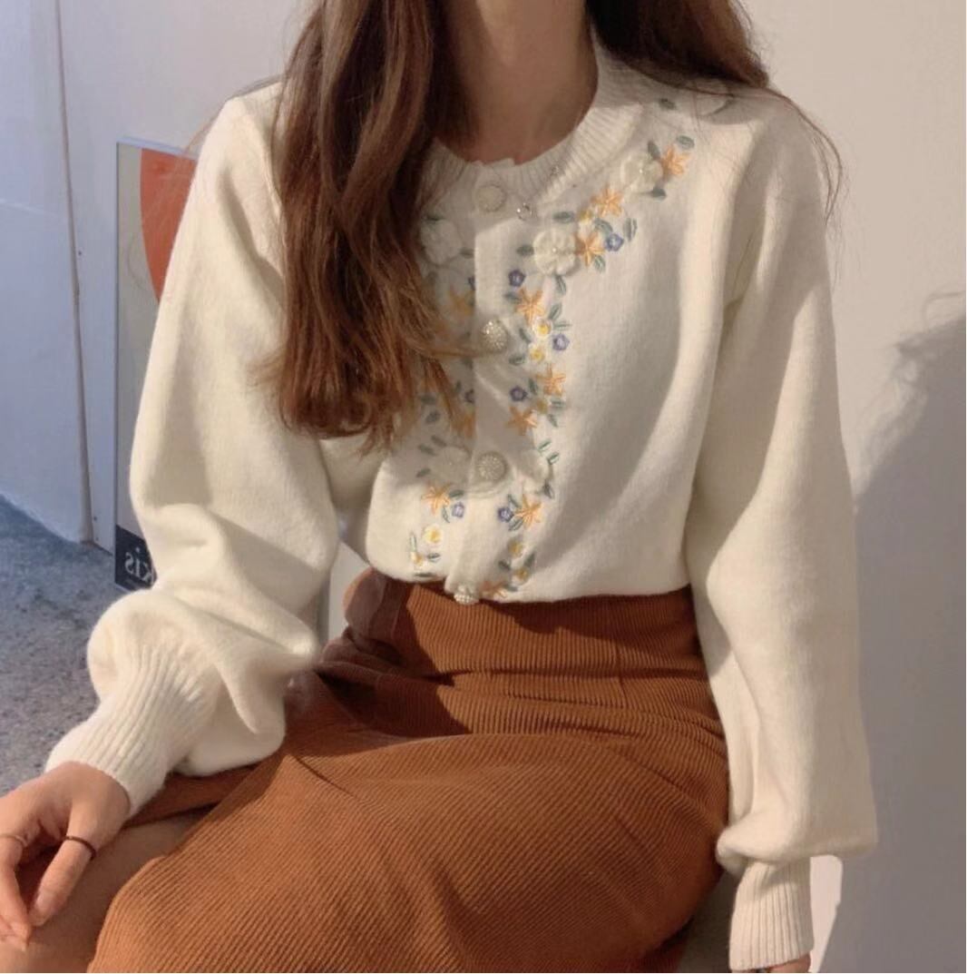 トップス カーディガン 白トップス 袖あり 長袖 ボリューム袖 ラウンドネック 襟なし 刺繍 前開き ニット かわいい 大人可愛い きれいめ カジュアル 大人 上品 おしゃれ お洒落 レトロ 大人女子 ラブリー キュート ガーリー 花柄 小花柄 フラワー 秋 冬 10代 20代 30代 レディース 女性用 女の子 オフィス ビジネス OL 通勤 学生 通学 デート 着回し 普段使い 韓国 韓国系 オルチャン ファッション モテ 体系カバー フリーサイズ ゆったり ゆる 白 ホワイト | Ritta