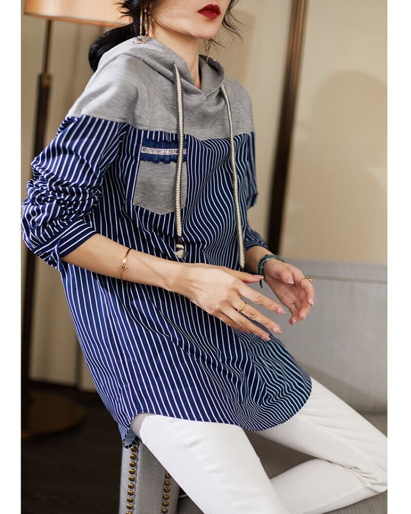 ストライプシャツの大人可愛さに、フーディーのカジュアルさをプラス。