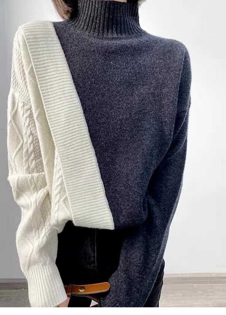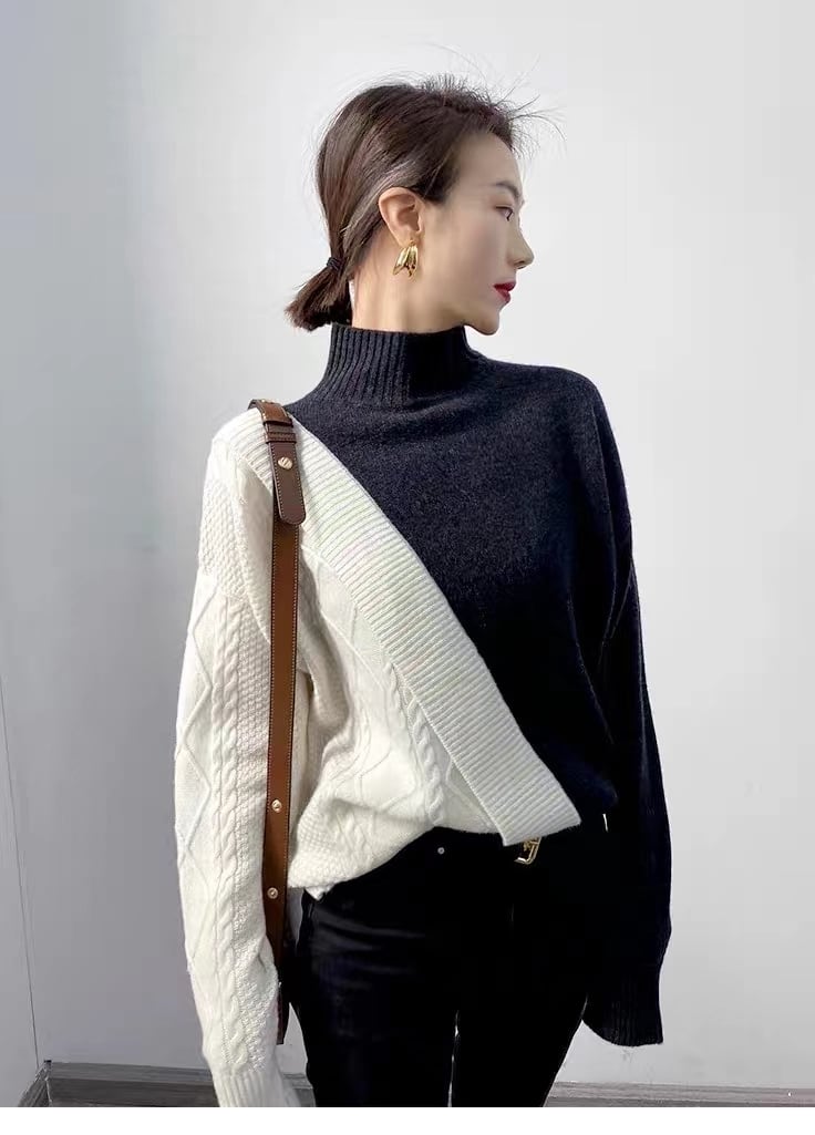 ハイネックのシンプルセーターと、編み込みニットを組み合わせた存在感抜群のセーター。