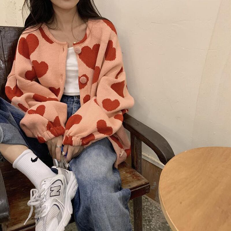 トップス アウター セーター カーディガン ミディアム丈 長袖 ボリューム袖 萌袖 Uネック 襟なし もこもこ モコモコ ふわふわ 前開き ハート かわいい カジュアル おしゃれ お洒落 大人可愛い ラフ ラブリー キュート ガーリー ルーズ 個性的 柄 春 秋 冬 10代 20代 レディース 学生 通学 デート 女子会 休日 普段使い韓国 韓国系 コーデ スタイル 暖かい モテ 体系カバー プレゼント 大きい 大きめ ゆったり ゆる サイズ 春カラー ニット ピンク ハート柄 女子 女の子 | Ritta