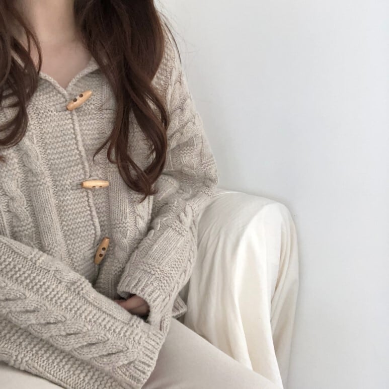 アウターとしても使えるアイテムです。大き目の襟と、ケーブルニットが可愛い!