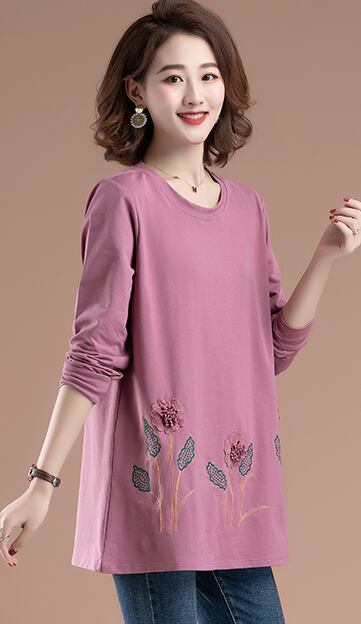 裾のフラワー刺繍がキュートで、チュニックとしてもピッタリな丈が長めのカットソー。