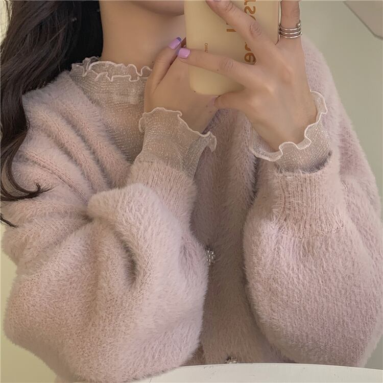 透け感のあるラメ入り生地が可愛いハイネックトップス。