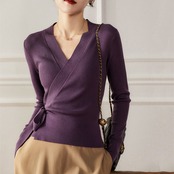 トップス ニットソー 袖あり 長袖 Vネック 襟なし スリム タイト 細身 リボン ベルト ニット セーター クロス クロスタイド きれいめ シンプル 大人 上品 おしゃれ お洒落 かっこいい レトロ エキゾチック 大人女子 大人女性 個性的 クール モード系 セクシー エレガント モダン 主役級 存在感 無地 春 秋 冬 レディース 女性用 ママ ビジネス OL デート お出かけ パーティー リゾート 旅行 高原 ホテル ガーデン レストラン スタイル モテ M L XL 色展開 黒 紫 ベージュ | Ritta