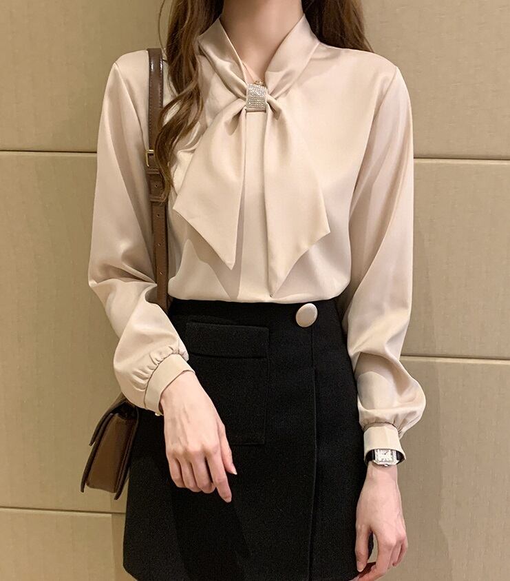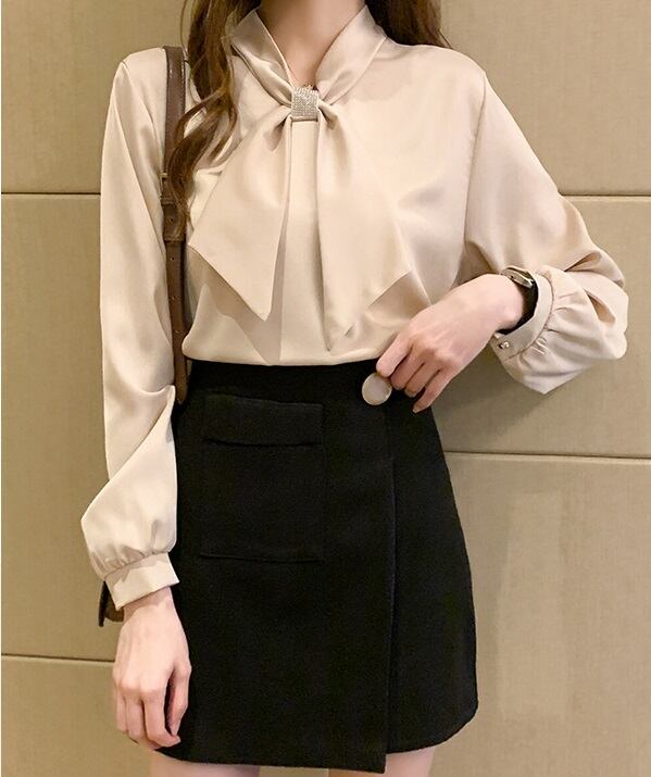 大きなリボンとそれを留めるアクセサリーが美しいブラウス。