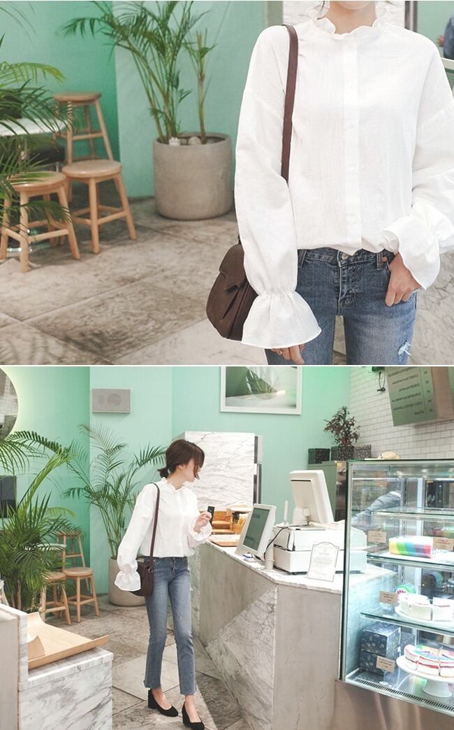 襟と袖のフリルデザインがキュートなブラウス。