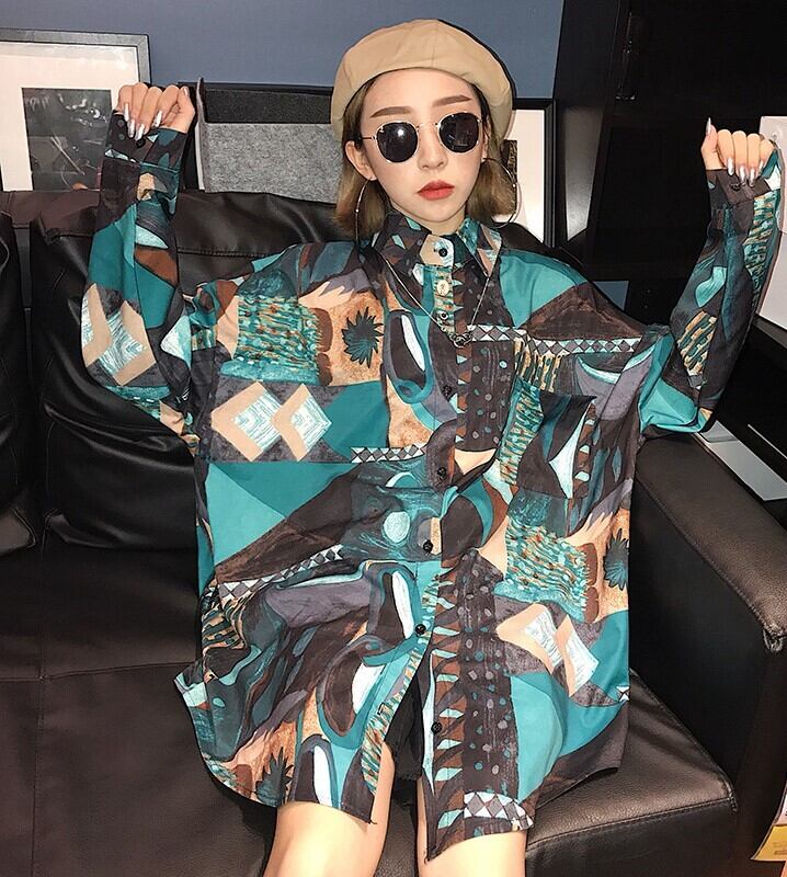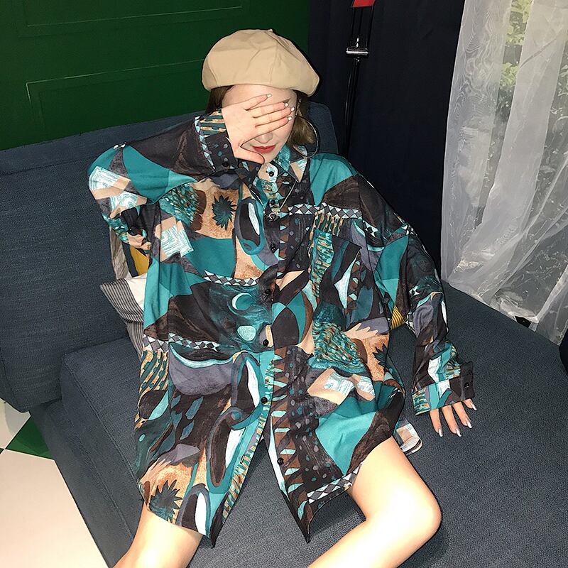 トップス シャツ ロング 長袖 ボリューム袖 襟付き ワイド 前開き かわいい 大人可愛い 上品 おしゃれ お洒落 かっこいい 大人女子 こなれ感 ルーズ 個性的 クール エレガント 主役級 存在感 とろみ感 柄 秋 10代 20代 30代 レディース 女性用 学生 通学 デート お出かけ 女子会 休日 パーティー イベント ホテル レストラン 韓国 韓国系 オルチャン ファッション コーデ スタイル 体系カバー S M L XL 大きめ ビッグサイズ ゆったり ゆる 青 ブルー 緑 グリーン | Ritta