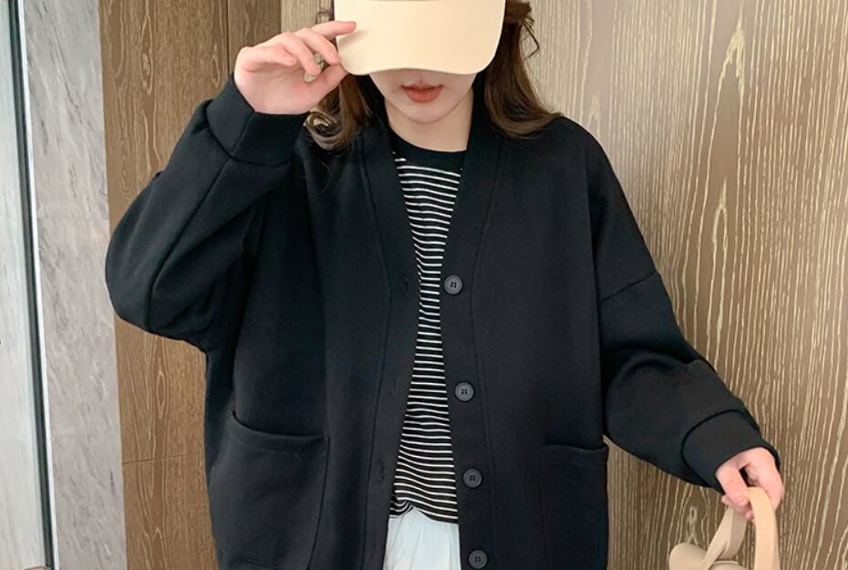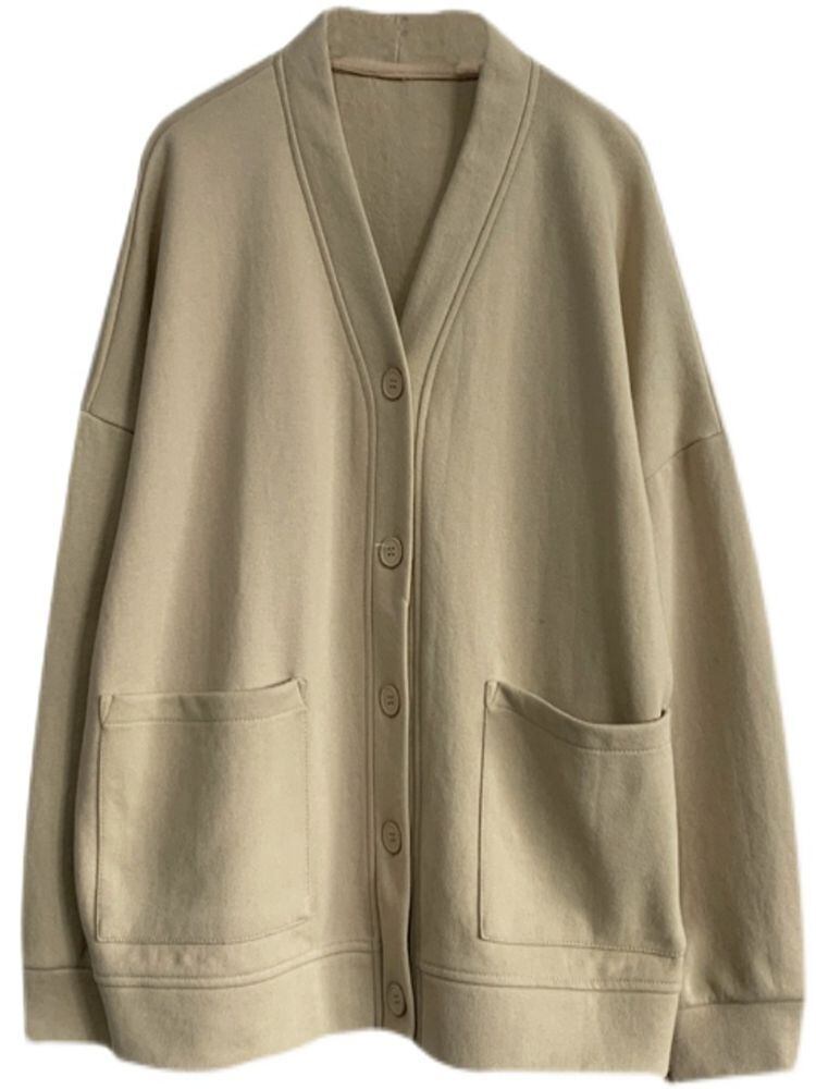 ベースボールシャツ風カーディガン トップス アウター カーディガン 袖あり 長袖 ドロップショルダー Vネック 襟なし ポケット 前開き 伸縮性 かわいい 大人可愛い シンプル カジュアル ワイド おしゃれ お洒落 こなれ感 メンズライク ボーイッシュ スポーティー 無地 春 秋 10代 20代 30代 40代 レディース 女性用 ママ 学生 通学 お出かけ 休日 旅行 着回し 普段使い 重ね着 お揃い 楽ちん スタイル コーデ 体型カバー フリーサイズ ゆったり 黒 ブラック アプリコット | Ritta