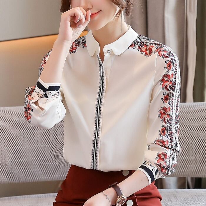 肩から袖口にラインで入ったレトロな花柄が特徴のブラウス。