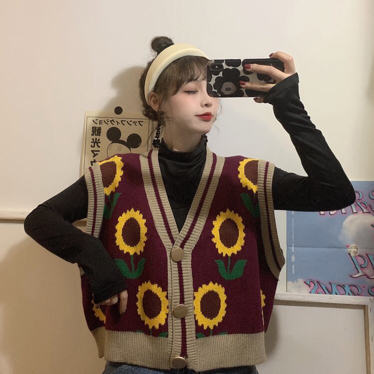ひまわり柄ニットベスト トップス ベスト 大きめボタン ショート丈 袖なし ノースリーブ Vネック 襟なし ワイド 前開き 伸縮性 ニット かわいい 大人可愛い カジュアル おしゃれ お洒落 レトロ こなれ感 個性的 存在感 柄 春 秋 10代 20代 30代 40代 レディース 女性用 ママ マタニティ 女の子 学生 通学 デート お出かけ 休日 着回し 普段使い 重ね着 お揃い 双子 ファッション コーデ スタイル 着回し 楽ちん レイヤードコーデ ゆったり フリーサイズ 黒 ブラック ワインレッド | Ritta