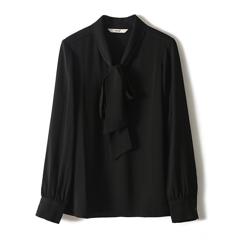 胸元のリボンが印象的なとろみのある生地のブラウス。