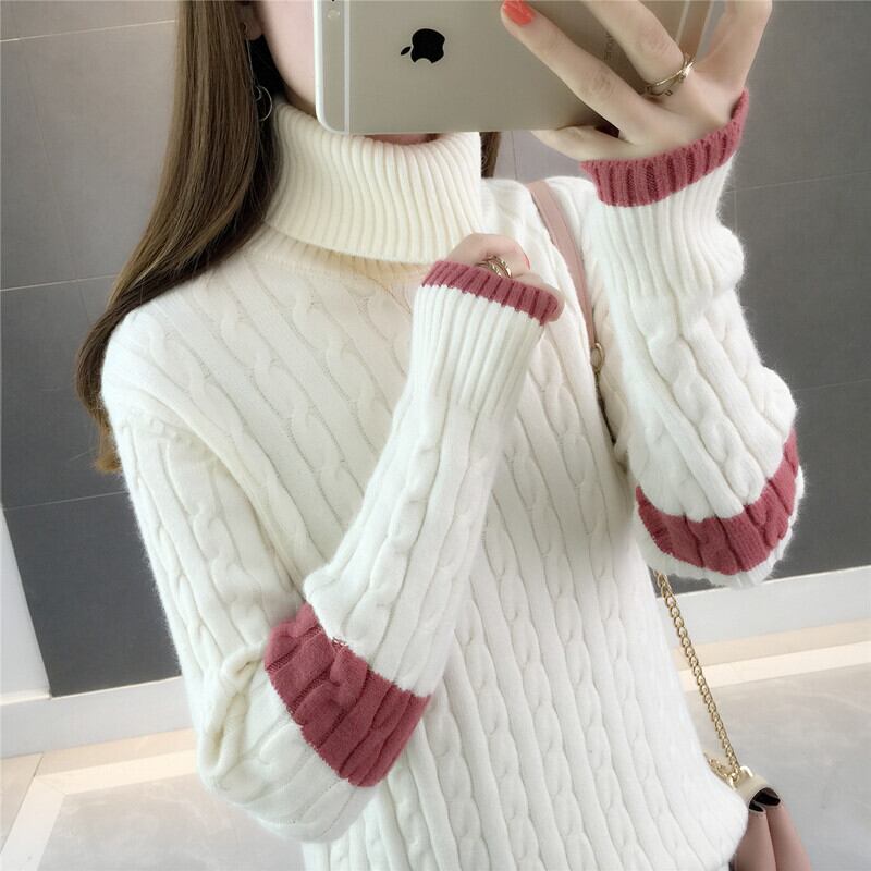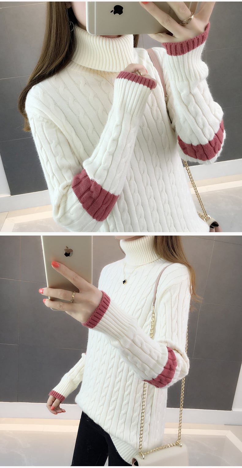 袖のカラーリングのデザインがキュートなケーブルニットセーター。