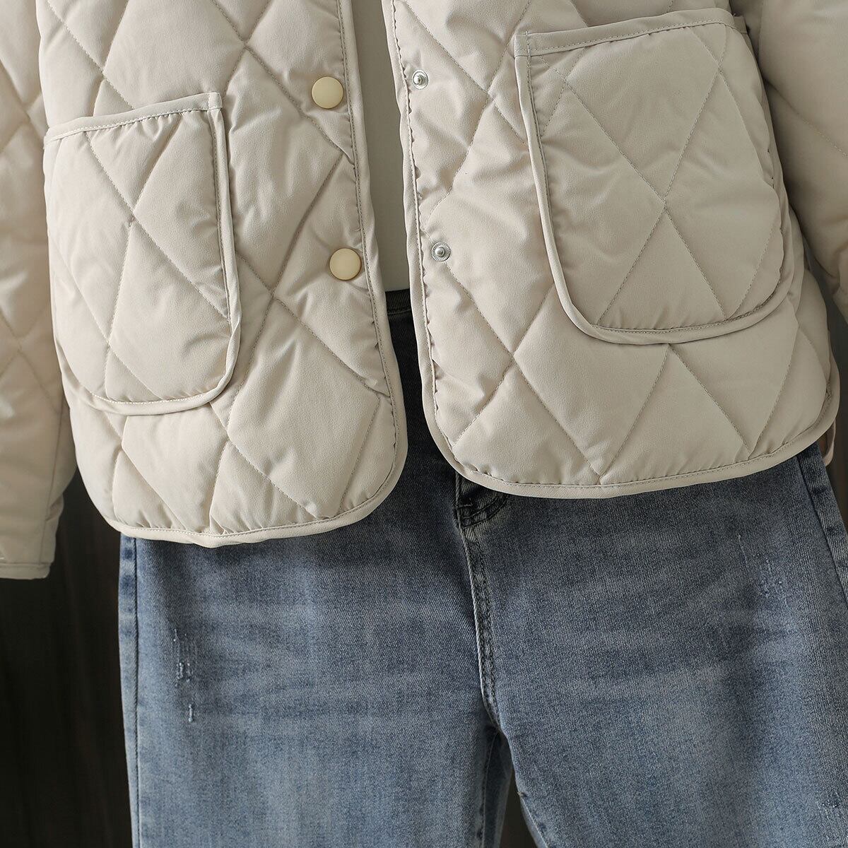 大きめ格子柄のキルティングが立体的なノーカラーアウター。