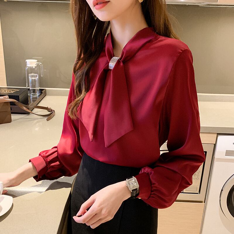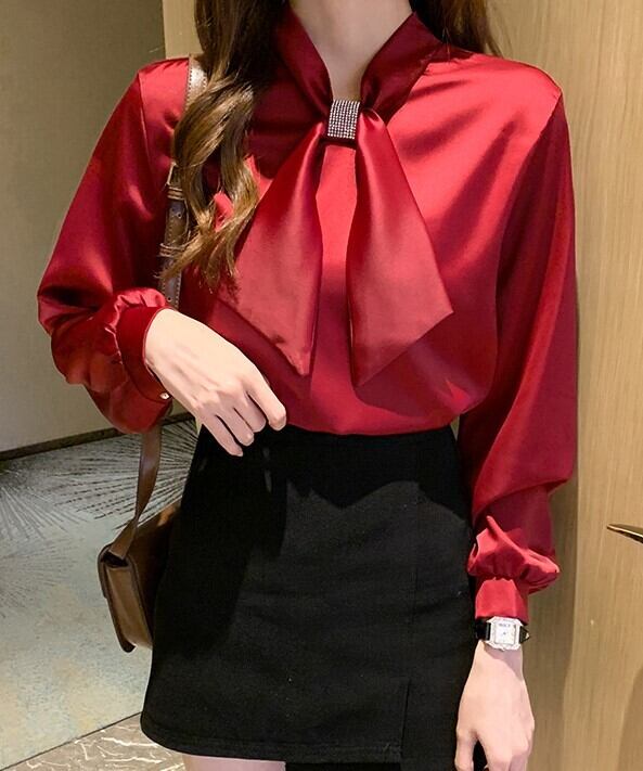 襟元のリボンタイ留めがキラキラと印象的なシフォンシャツ。