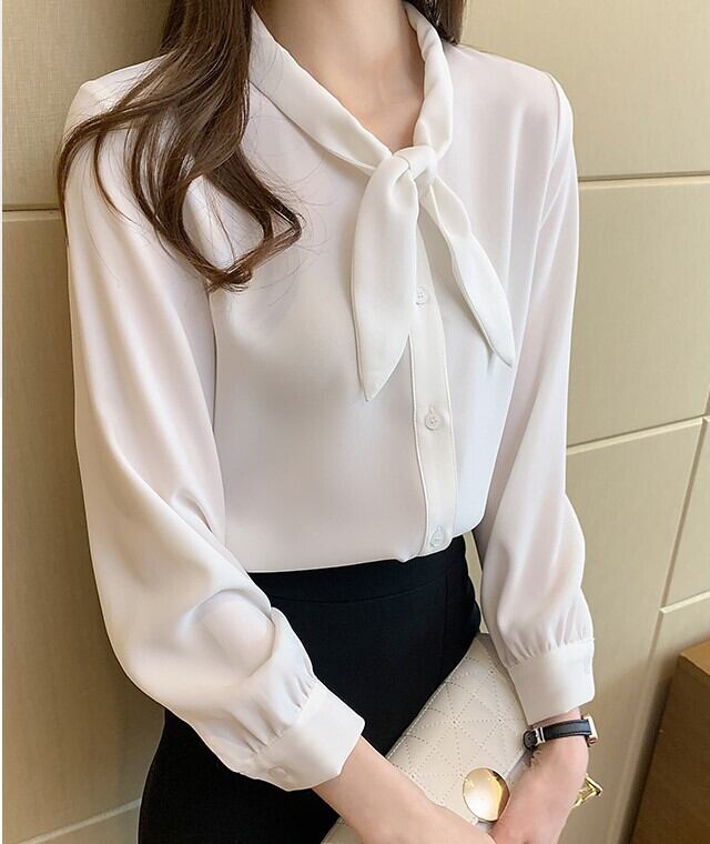 ウサギの耳のような形のリボンタイがキュートなシフォンシャツ。