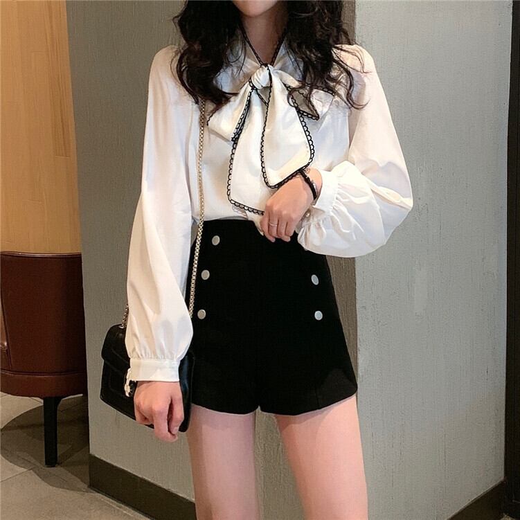 パイピングデザインの大きなリボンが目をひく長袖ブラウス。