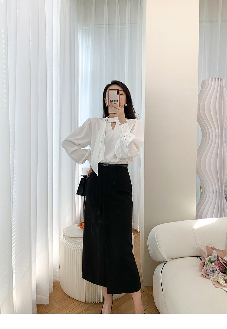 とろみのある生地とスカーフのようなデザインがおしゃれなブラウス。