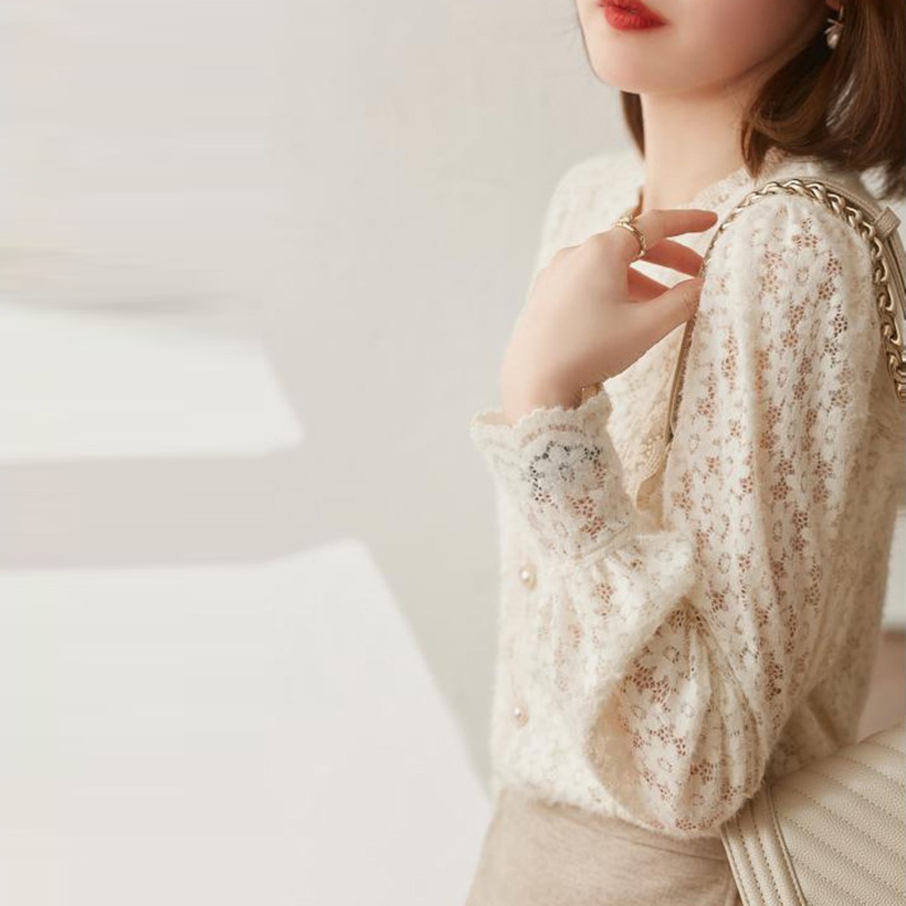 透け感のある花柄レース生地が可愛い長袖カーディガン。
