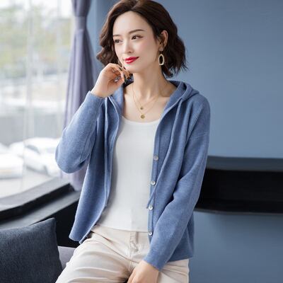 シンプルなデザインでどんなコーデにも合わせやすいニットフーディーカーディガン。