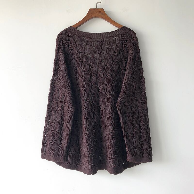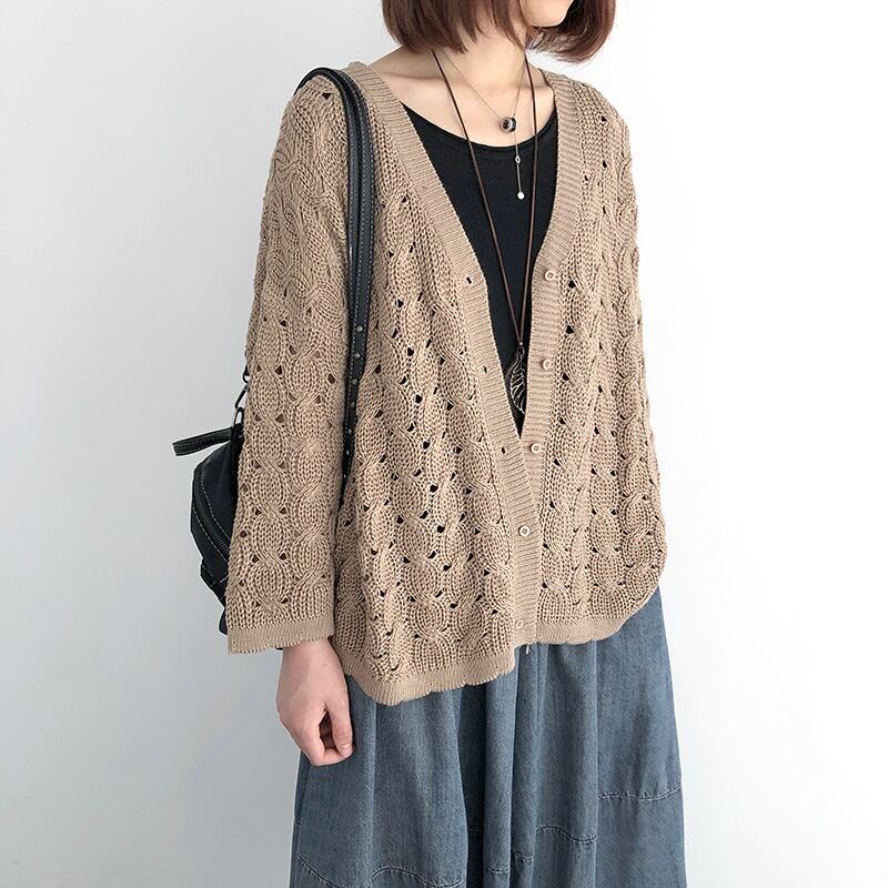 粗目の編み目で透け感を出したニットカーディガンです。