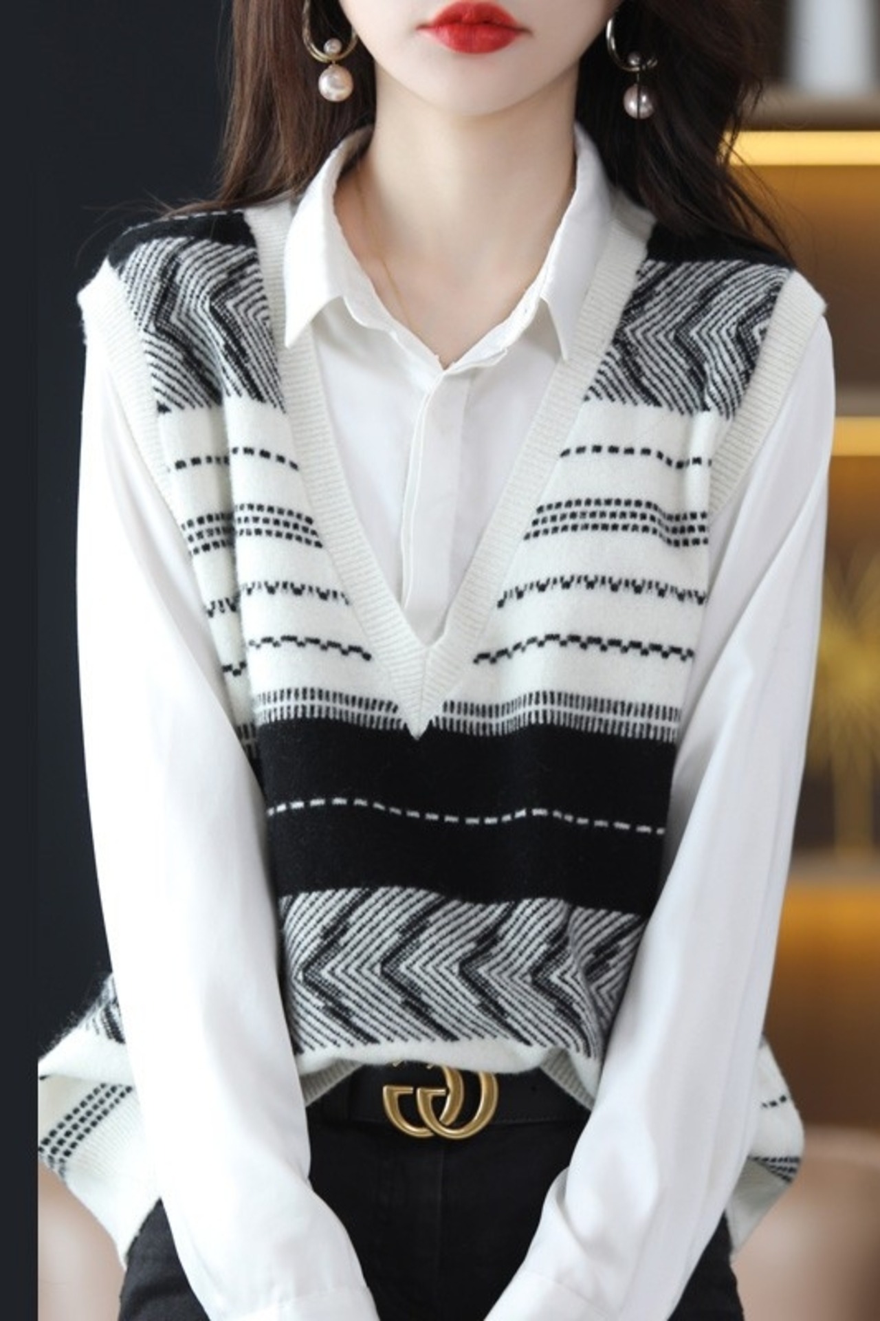 個性的な柄がこなれ感を演出するVネックニットベスト。