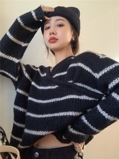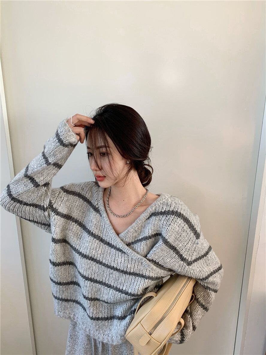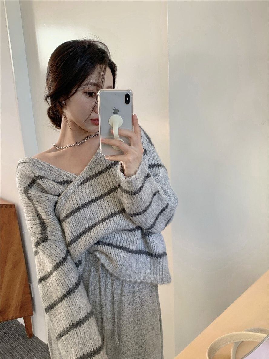 トップス ニットソー セーター 袖あり 長袖 Vネック ストレート ワイド Iライン かわいい 大人可愛い きれいめ シンプル カジュアル 大人 上品 おしゃれ お洒落 かっこいい レトロ 大人女子 こなれ感 ラフ メンズライク ルーズ クール モード系 とろみ感 抜け感 ボーダー 春 秋 冬 10代 20代 30代 レディース デート お出かけ 女子会 お泊まり 休日 着回し 普段使い 韓国 韓国系 オルチャン ファッション コーデ スタイル 楽ちん モテ 定番 プチプラ トレンド 流行 インスタ映え | Ritta
