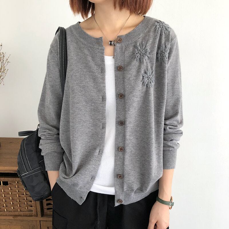 胸についた花柄の刺繍が素敵な、薄手のニットカーディガンです。