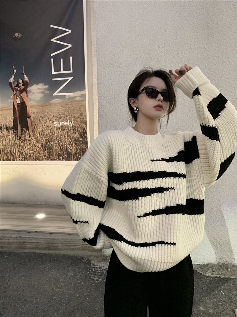 太めのリブに派手過ぎないゼブラ柄がおしゃれなニットトップス。