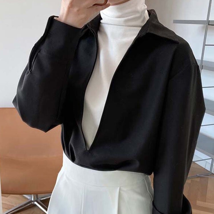 大きくスリットが胸元に入ったVネックシャツと、ハイネックのカットソーのセット。