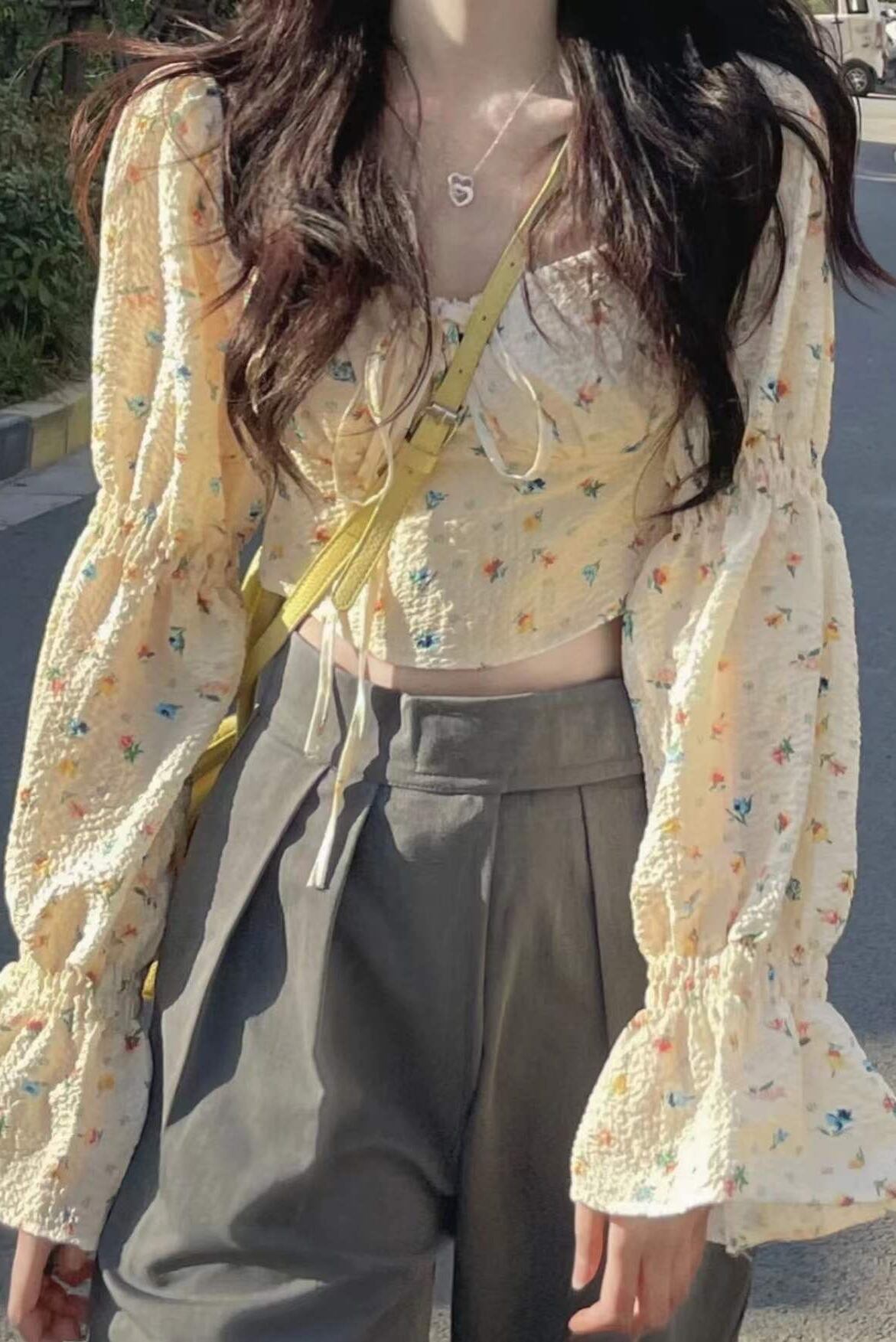 トップス ブラウス ショート ショート丈 袖あり 長袖 ボリューム袖 フレアスリーブ 萌袖 ワンショル リボン 2way かわいい 大人可愛い カジュアル おしゃれ 大人可愛い 大人女子 こなれ感 ラブリー キュート ガーリー セクシー 抜け感 花柄 小花柄 フラワー 春 夏 秋 10代 20代 30代 レディース 女性用 学生 通学 デート お出かけ 公園デビュー 女子会 休日 旅行 普段使い 韓国 韓国系 モテ S M L 黄色 イエロー | Ritta