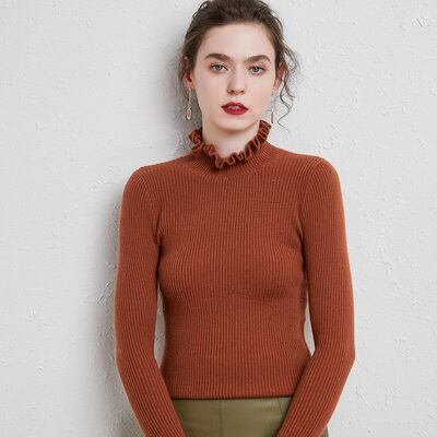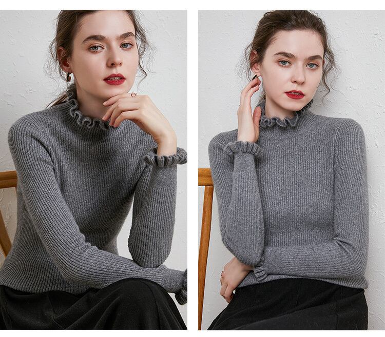 袖と襟のフリルデザインが可愛いリブニットタートルネック。