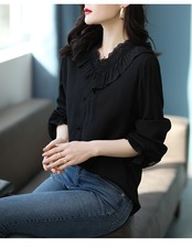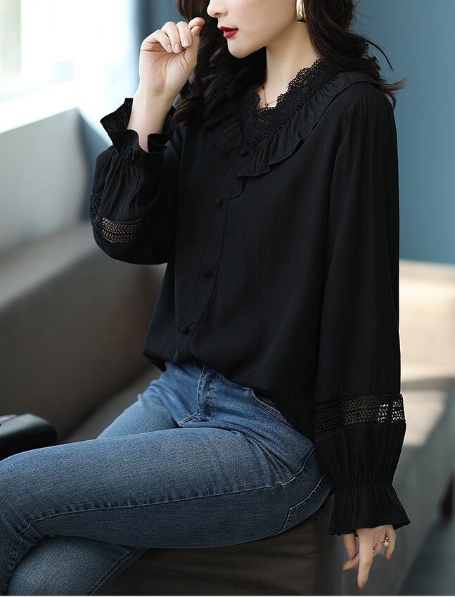 襟元のレースと、袖に入ったカッティングが美しい大人ブラウスです。