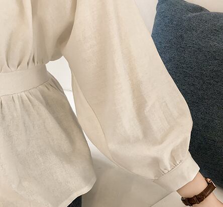 ウエストラインでギャザーでタイトになっている、ペプラムのようなシルエットのシャツ。