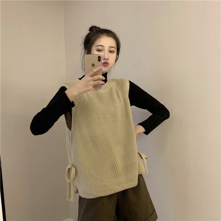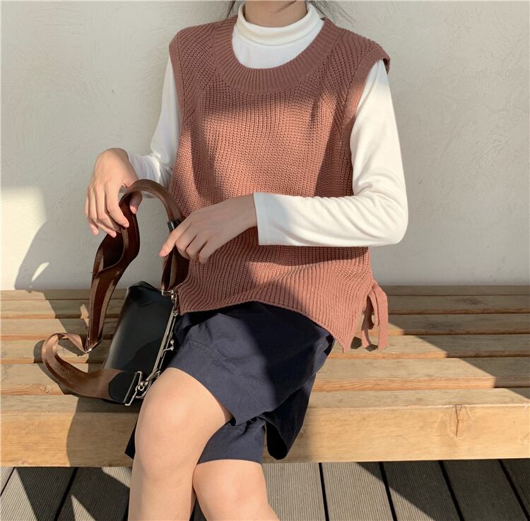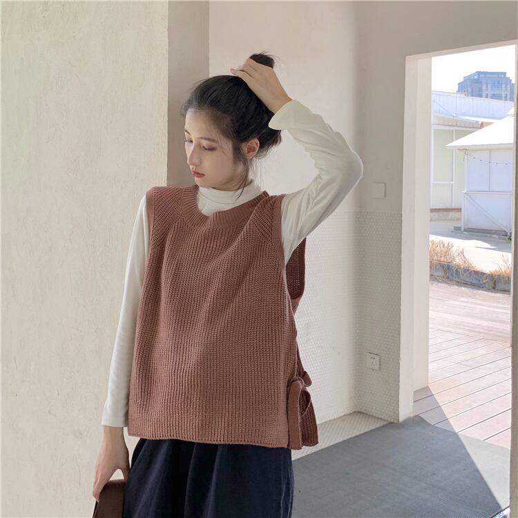 サイドの入ったスリットをリボンで結ぶ形のニットベスト。