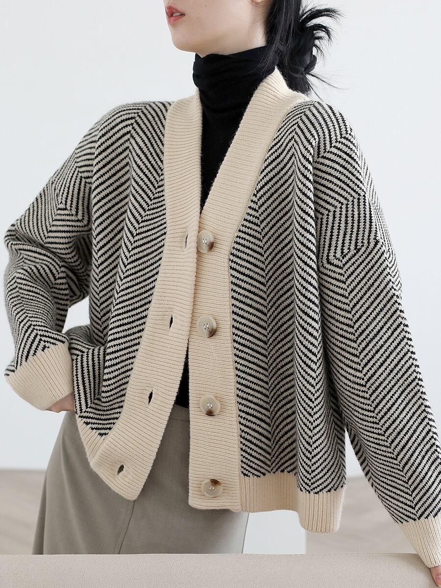 レトロな雰囲気ただよう、大きなボタンとパイピングがキュートなニットカーディガン。