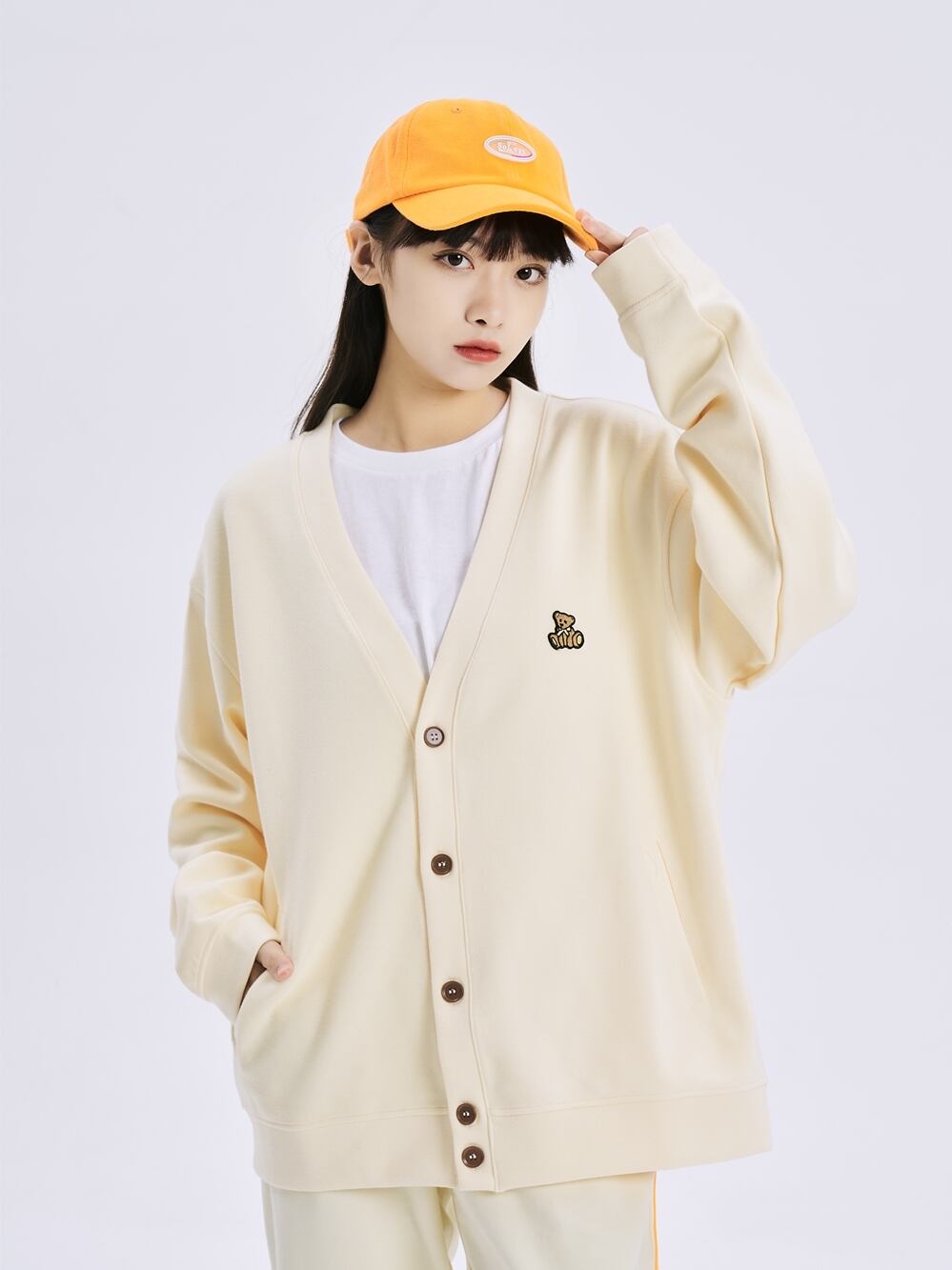 胸に可愛くあしらわれた、クマちゃんのワッペンがポイントのカレッジライクなカーディガン。