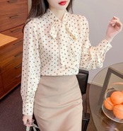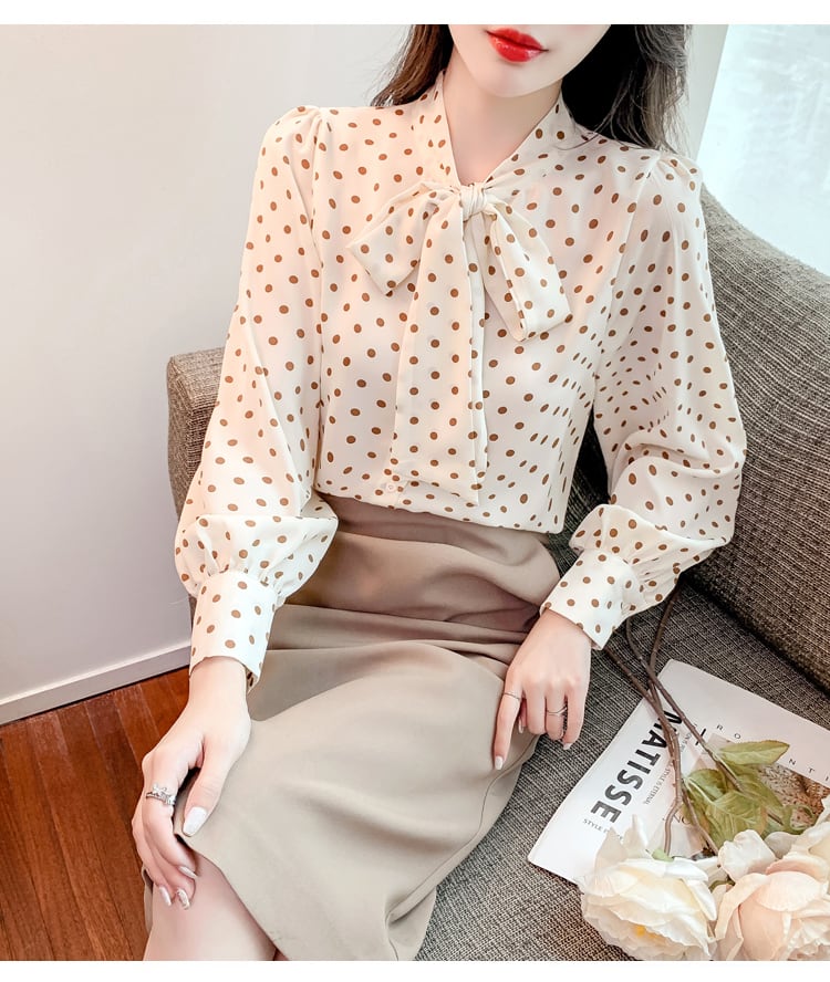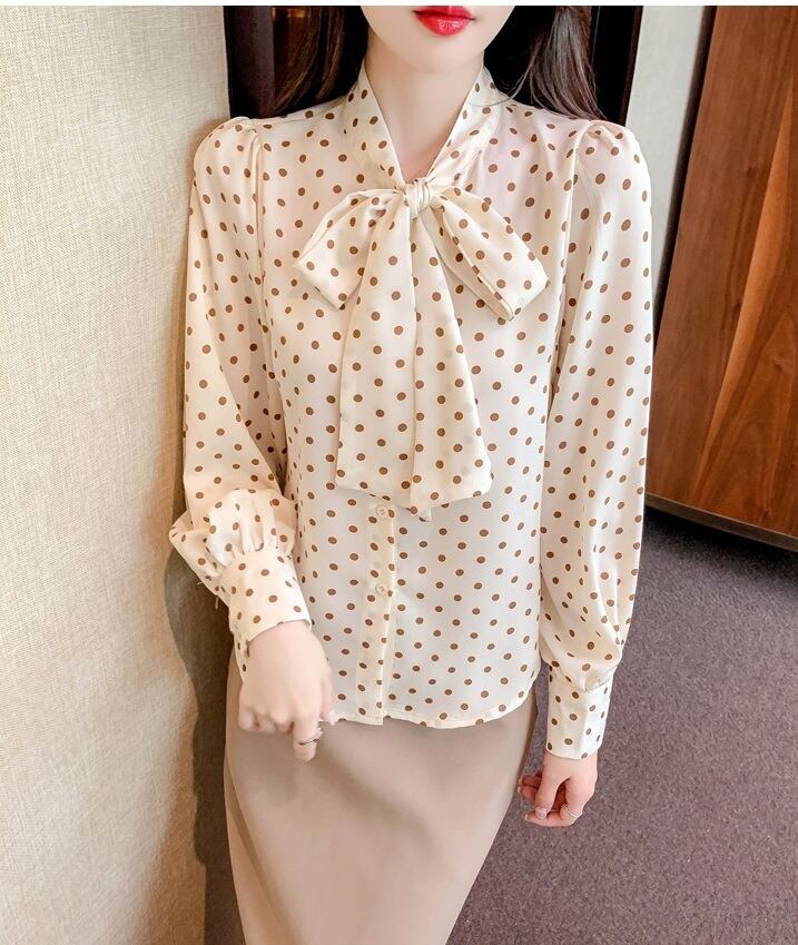 胸元のリボンが大人の雰囲気のドット柄ブラウス。