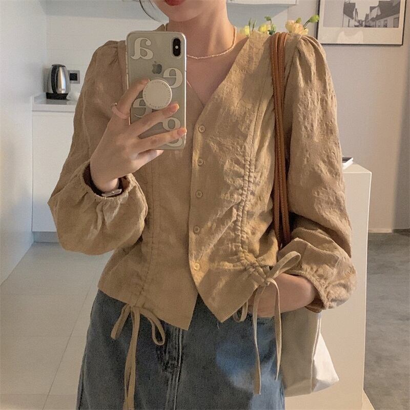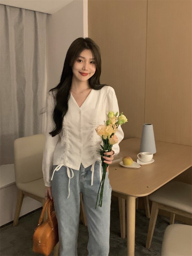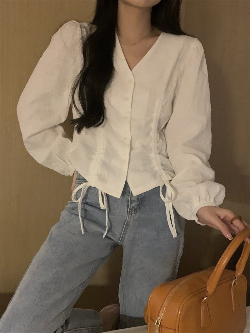 トップス シャツ 白シャツ 白トップス 袖あり 長袖 ボリューム袖 萌袖 Vネック 襟なし スリム ストレート リボン ウエストマーク 前開き 薄手 かわいい 大人可愛い シンプル カジュアル 大人 上品 おしゃれ お洒落 レトロ 大人女子 こなれ感 ラフ ラブリー キュート ガーリー 個性的 主役級 存在感 抜け感 無地 春 夏 レディース 女性用 ビジネス OL 学生 デート お出かけ 女子会 お泊まり 休日 パーティー イベント 旅行 高原 ホテル ガーデン レストラン 普段使い サイズ | Ritta