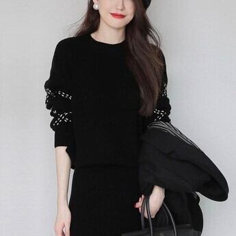 ボリュームのあるニットと、ふんわりとした雰囲気のニットスカートのセットアップ。