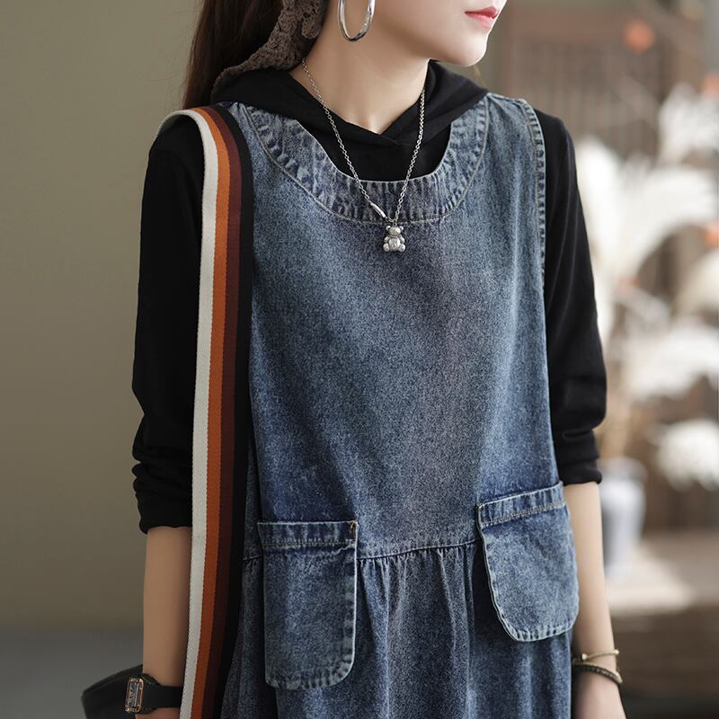 デニムジャンパースカート スカート ボトムス オールインワン サロペット ミモレ ミモレ丈 袖なし ノースリーブ ラウンドネック Aライン ポケット ハイウエスト デニム かわいい 大人可愛い シンプル カジュアル おしゃれ お洒落 レトロ こなれ感 ラフ 個性的 無地 春 夏 秋 冬 10代 20代 30代 40代 レディース 女性用 ママ マタニティ お出かけ 休日 着回し 普段使い 重ね着 ファッション コーデ スタイル 楽ちん 体型カバー M L XL 2XL ゆったり | Ritta