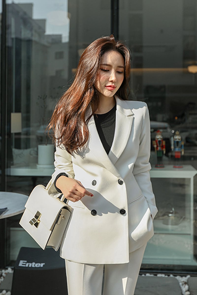 ダブルのジャケットとセミフレアになっているパンツの、フォーマルにもカジュアルにも着やすいセットアップ。